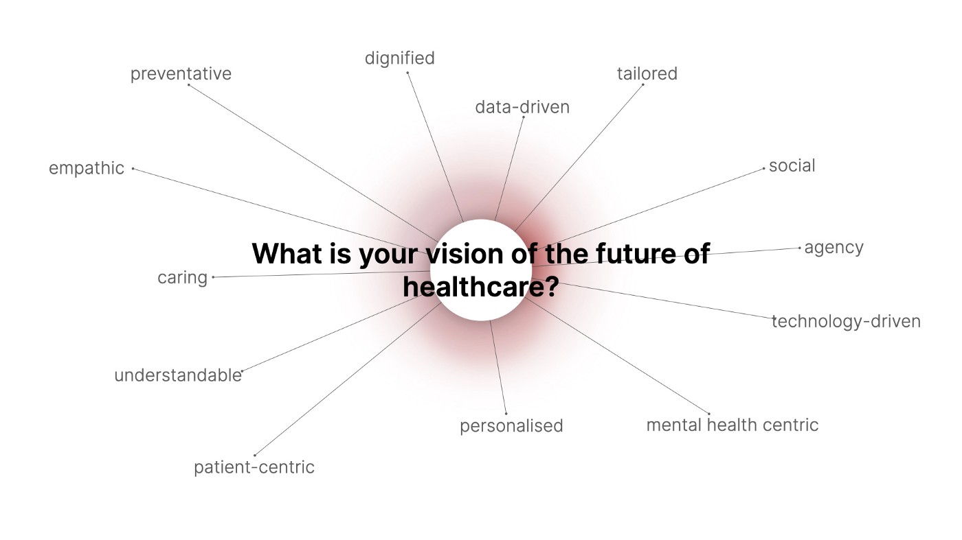 In a remote workshop with the client and our colleagues, we presented our findings and sacrificial prototypes and gave them time to give anonymous, written feedback using a form. When we asked the participants how they envisioned healthcare, and how these concepts fit into their mental models, several trends emerged:Personalised, Patient-centric, Social and Data Driven.